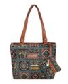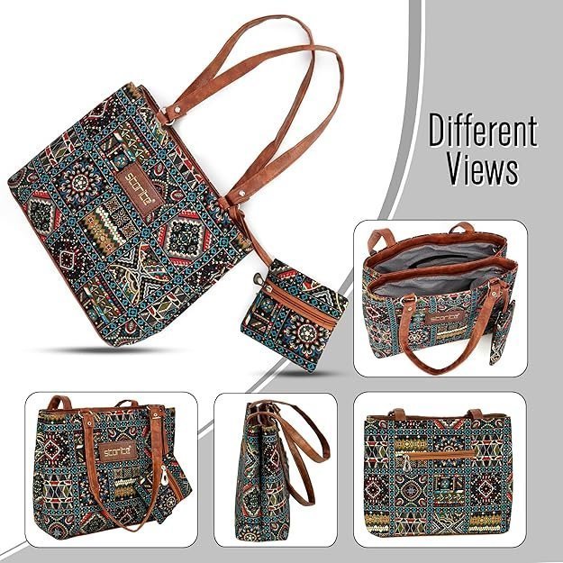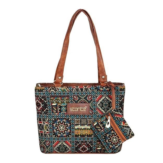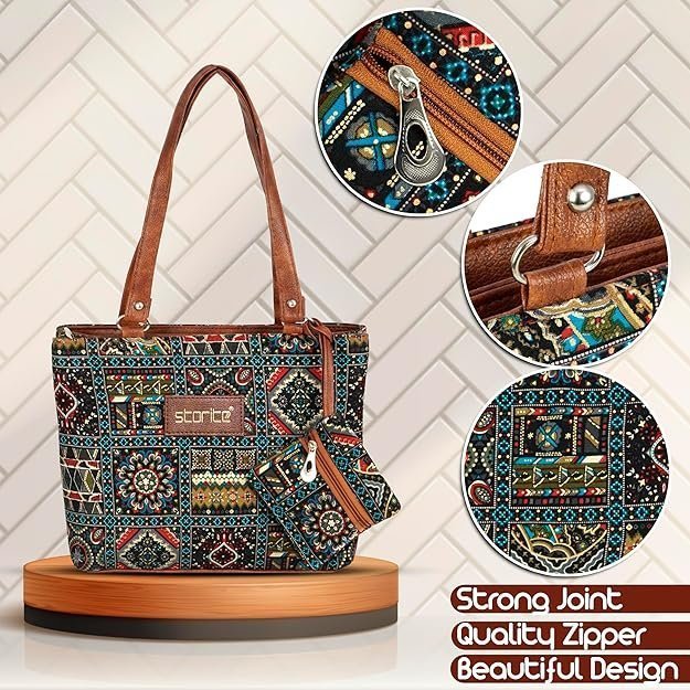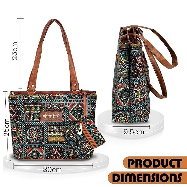 Storite Women’s Tote Bag With Leather Handles & Embroidery Printed Handbag With Zip Pockets, Shoulder Tote Bag And Handbag For Office And College